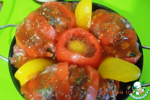 Сковороду смазать растительным маслом и выложить по кругу помидоры (серединка оказалась пустой, поэтому добавила яйцо в помидорчик). Перчик разделить на дольки и вставить в пустоты. Залить помидоры таким соусом: 1ст. л томатной пасты размешать в 1 ст. бульона. Ставим в духовку при температуре 190 градусов на 40-45 минут.