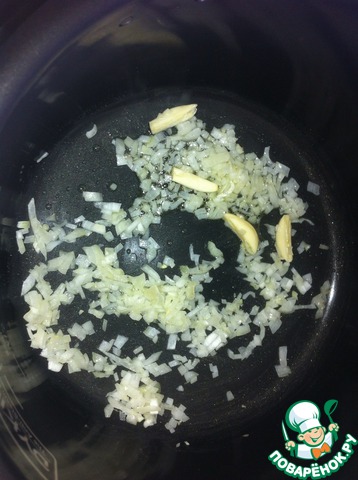Разогреть сковороду, добавить 2 ст. л. оливкового масла и обжарить до полуготовности лук и чеснок. Добавить томатную пасту и обжаривать 5 минут.