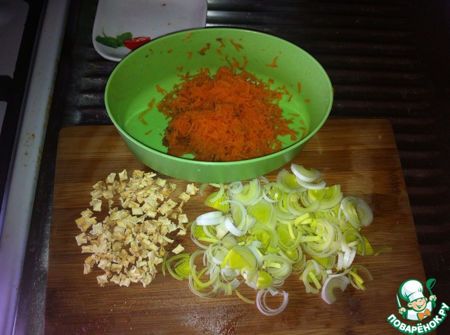 Пока тушится соус томатный, готовим ингредиенты для фарша. Мелко натираем морковь, режем лук-порей, мелко на кубики рубим сельдерей, режем болгарский перец и чеснок. Все овощи обжариваем на сковороде на оливковом масле до готовности.