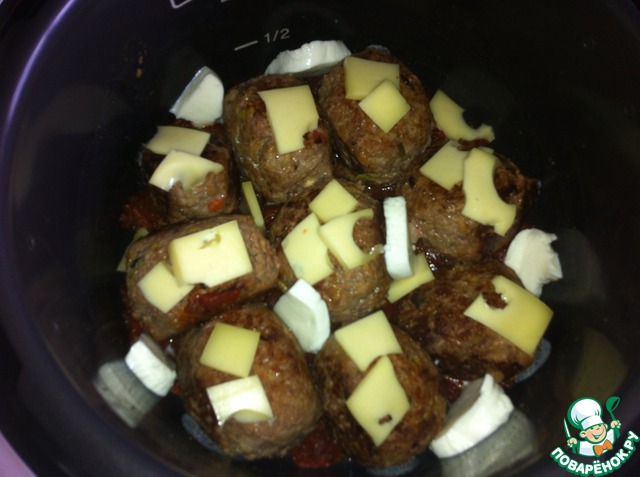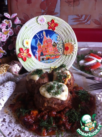 Обжаренные куличики помещаем в кастрюлю (кастрюля должна быть тяжелой), добавляем уже готовый томатный соус, на куличики кладем сыр голландский по кусочку и в саму кастрюлю сыр моцареллу и оставшийся голландский сыр. Закрываем крышкой и тушим 25-30 минут на медленном огне.