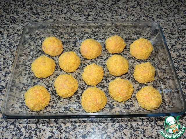 Обычно крокеты обжариваются во фритюре. Предлагаю более простой и полезный вариант приготовления - в духовке (корочка получается такой же хрустящей). Для этого шарики выложить в смазанную маслом форму и запекать около 30 минут при 180 градусах.