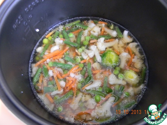 Овощи и рис загружаем в мультиварку, добавляем соль по вкусу, цедру лимона, воду и соевый соус и ставим режим "на пару" на 20 минут.