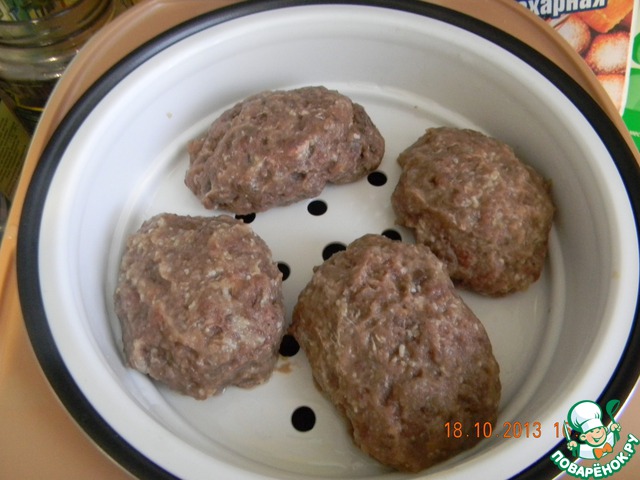 Идеальный вариант для тех, кто следит за фигурой. Несколько ложек овсяных хлопьев быстрого приготовления можно залить холодной водой и, когда они немного набухнут, вмешать в фарш. Главное после этого – размешать его как следует, иначе могут получиться котлеты с овсяной кашей. Если фарш промешан хорошо, овсяные хлопья придадут котлетам пышность. Котлеты ставим в мултиварку, режим "на пару" на 20 минут.