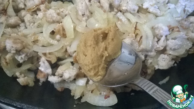 Фарш посолить (но не очень сильно, т. к. томатная паста тоже бывает соленая), поперчить, обжарить на масле пока не станет светлым. Лук почистить, порезать полукольцами, добавить к фаршу, обжарить до прозрачности лука.