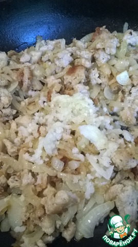 Выдавить или мелко порезать. Добавить к фаршу, перемешать. Обжарить еще минут 5.
