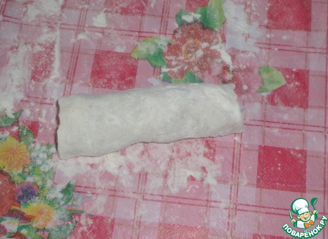 Тесто раскатать в пласт толщиной 5мм. Порезать на прямоугольники.
