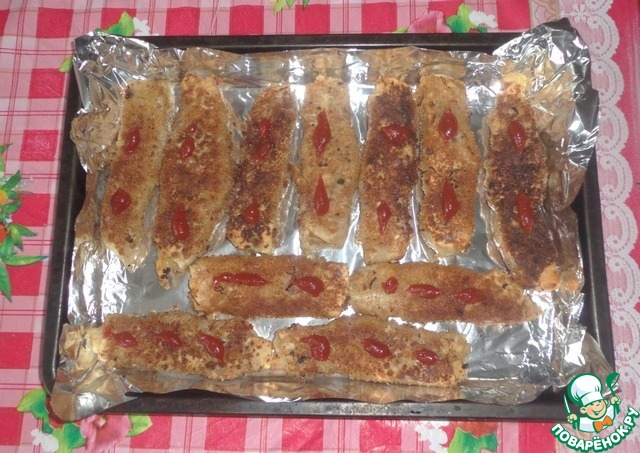 Форму для запекания застелить фольгой, рулетики выкладываем в форму и по поверхности рулетиков распределить кетчуп. Накрываем форму фольгой для того, чтобы наши рулетики пропарились и стали сочными. Ставим в духовку на 10 мин.