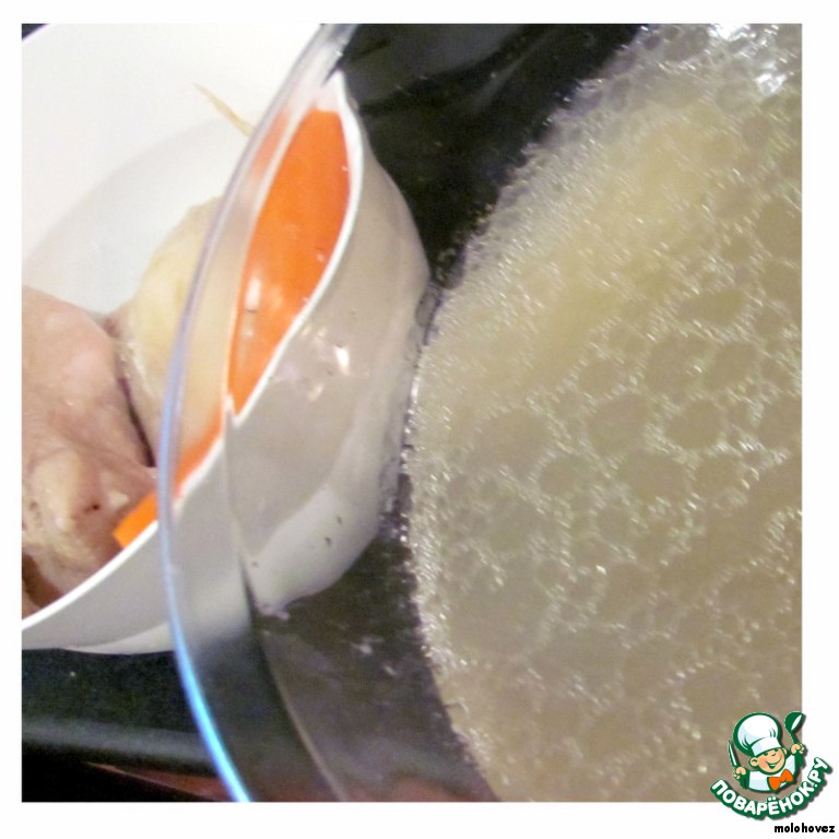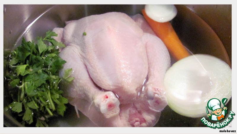 Курицу заливаю водой, чтобы она только была прикрыта. Добавляю лук, морковь и стебли петрушки и укропа. Даю закипеть, снимаю пену и ставлю вариться на маленьком огне под крышкой до готовности, что занимает, примерно, час.