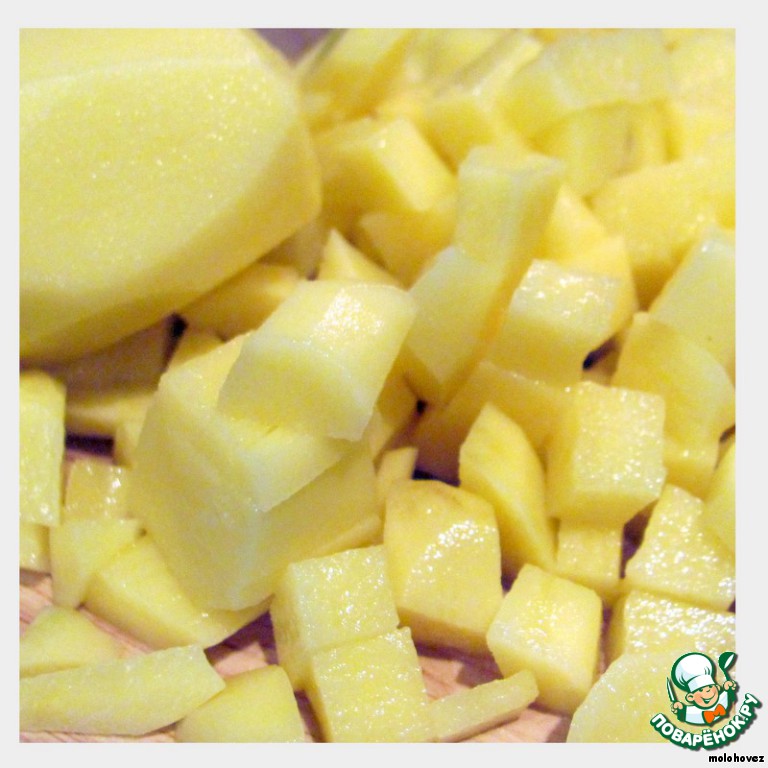 Мелко, как на салат, нарезаю картошку. Добавляю в бульон.