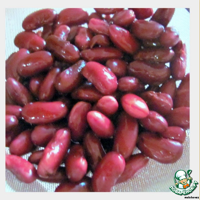Консервированную фасоль, слив жидкость, промываю в дуршлаге.