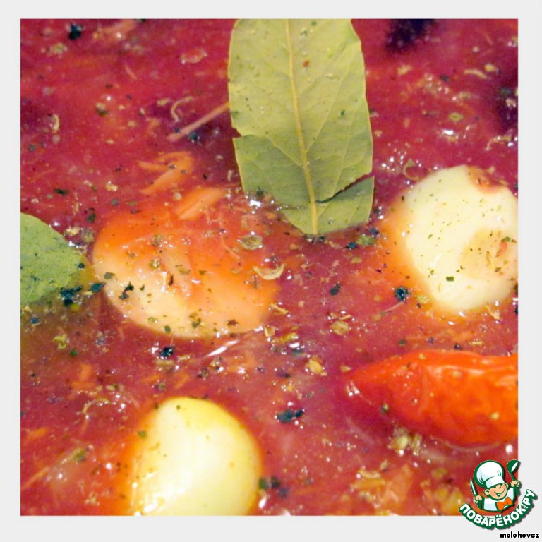 Закладываю в бульон капусту, зажарку, нарезанный мелко перец без кожицы, фасоль. Добавляю измельченную курицу, лавровый лист, чеснок, острый красный перчик, солю, перчу по вкусу. Затем вливаю грамм 100 маринада от свеклы. Перемешиваю все и пробую на вкус. Если кисловато, то добавляю столовую ложку мёда или темный сахар. Довожу до кипения. Убавляю огонь и провариваю минут 5-10. Выключаю и даю настояться.