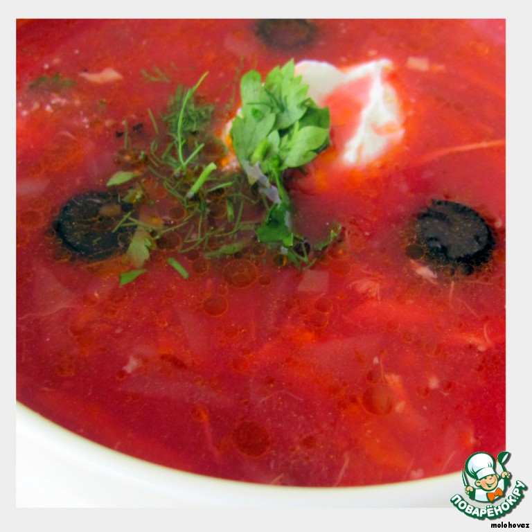 К счастью, нашла фото предыдущего борща! Здесь свекла нарезана соломкой и маслины не добавляла!