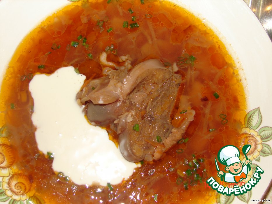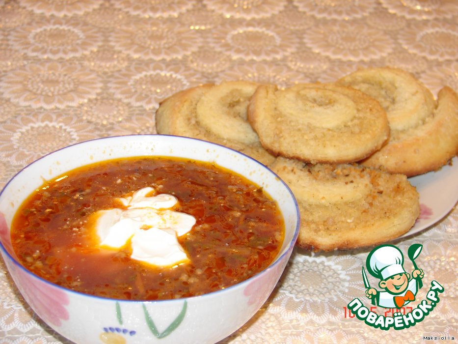 Маленькие советики:-если хотите борщ посытнее-положите вариться вместе с мясом 2-3 картошки(потом подавите еe в пюре и в борщ);