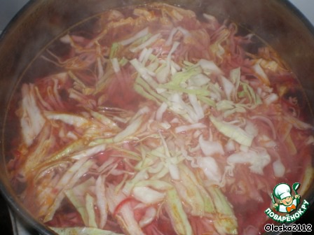 Тем временем вскипятим бульон,кладём в него 4 ст.л пассерованных овощей и закладываем капусту.Варим под крышкой 7 минут.