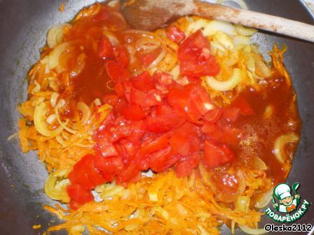 На сковороде пассеруем морковь в 2 ст.л растительного масла около 3 минут,добавляем лук,пассеруем ещё 2 минуты.После чего добавляем порезанный соломкой болгарский перец,мелко порезанный помидор и томатную пасту.Готовим около 3 минут на слабом огне.