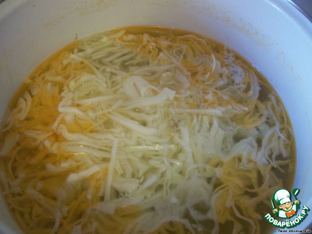 И сразу, самой первой, запускаем в бульон. Пусть она поварится подольше, так как капуста у меня зимнего сорта.