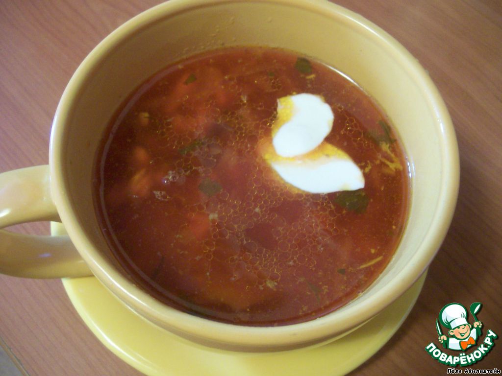 | Такой борщ мои детки предпочитают всем первым блюдам. С натуральной заправкой (не перестаю благодарить пани Касю за эту идею), приготовленной из овощей, выращенных на даче, этот борщ очень полезен для наших малышей! Этап конкурса: "Питательный обед". |