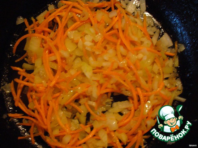 На сковороде растопить сало и обжарить в нем лук и морковь.
