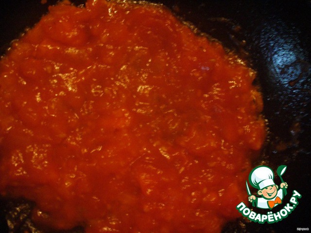 Помидоры обдать кипятком, потом сразу холодной водой, очистить от кожицы и нарезать кубиками. Обжарить на растительном масле вместе с пропущенным через пресс чесноком. Добавить томат-пасту и немного потушить.