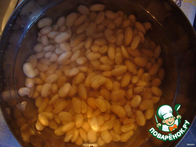 Фасоль на ночь замочить в холодной воде (или часов на 5). Отварить её. Варить столько, сколько указано на упаковке. Если не указано, то пробовать, в среднем она варится 1-1,5 (зависит от размера и сорта). Слить, промыть.