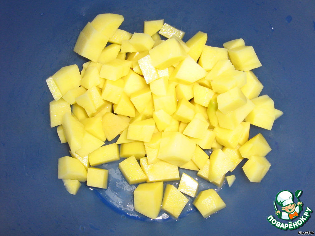 Картошку нарезаем кубиками и отправляем в готовый бульон. Косточку можно вынуть из бульона.