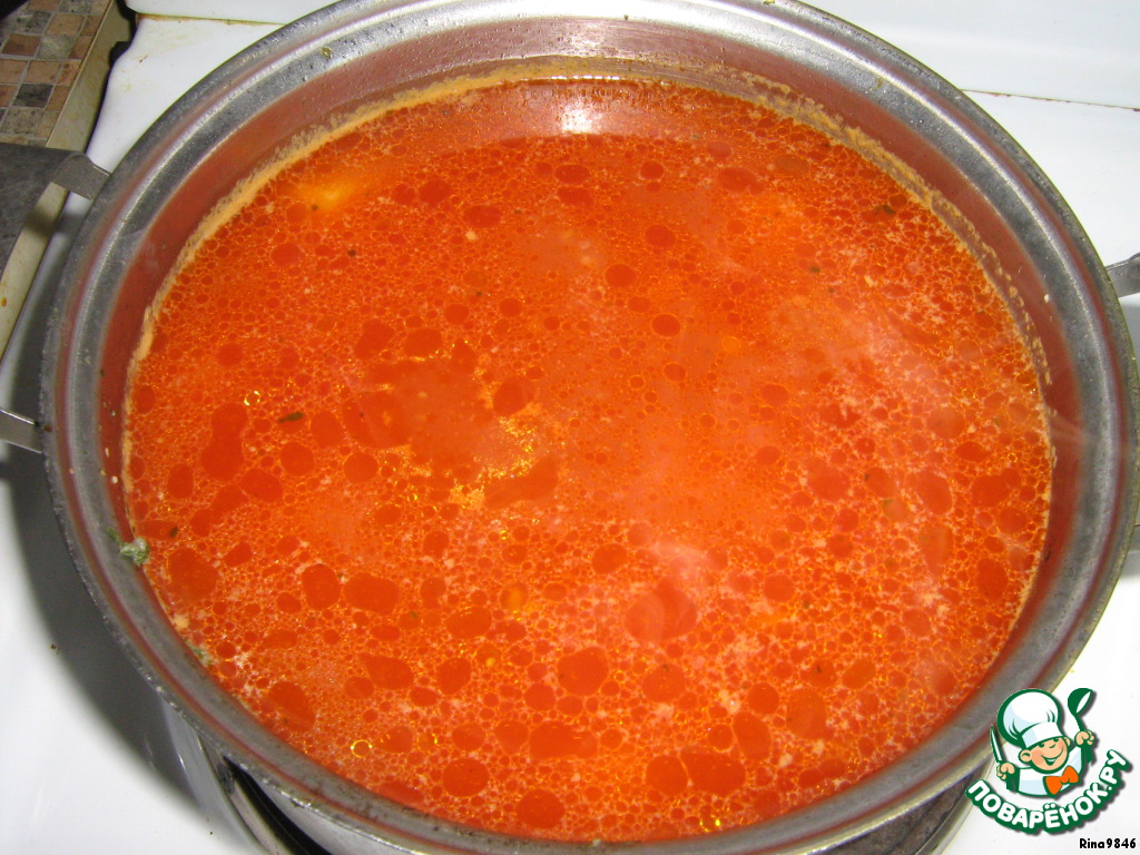 Заправка: мелко нарезанный лук, натертую морковку, натёртую свеклу обжариваем на подсолнечном масле. Томатную пасту разбавляем бульоном и выливаем в заправку. Томим 5 минут.