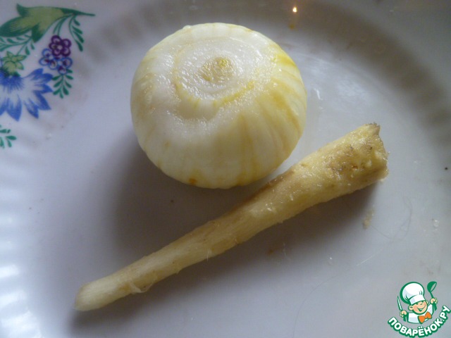 Добавим 1 луковицу и корешок пастернака. Пусть варятся до готовности лука. Затем их нужно вынуть, они нам не нужны. Свой вкус и запах они уже отдали бульону.