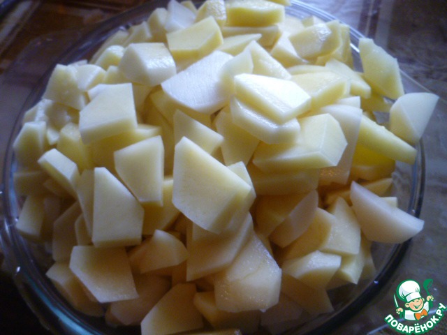 Начистить, помыть и нарезать кусочками картофель. Добавляем его к бульону. Как только картофель закипит, нужно посолить.