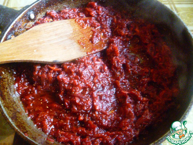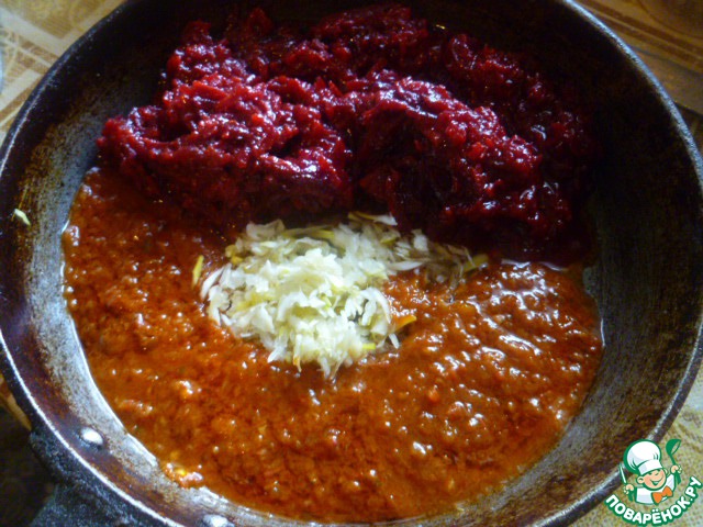 Делаем зажарку. Сразу скажу, что у меня на фото уже готовая зажарка. Я ее осенью закрываю в банки. В ее составе: свекла, морковь, растительное масло и помидоры. Если у вас такого нет, то свеклу и морковь натереть на терке. Обжарить вместе с луком на растительном масле, добавить томатный сок и аджику, потушить до густоты, минут 10.