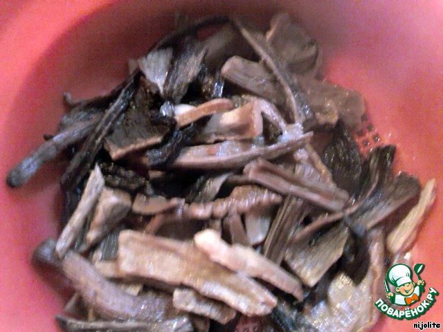 Грибы отвариваем. Сливаем. Отвар добавляем в борщ.