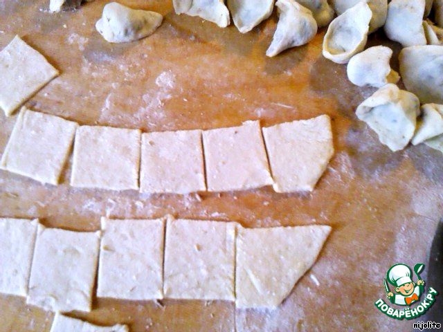 раскатываем, нарезаем на квадратики. Лепим ушки(как пельмешки)