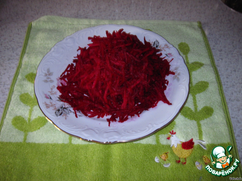 Выложить в сковороду свеклу, добавить сахар и уксус, дать постоять 3 минуты,налить воды и протушить под закрытой крышкой полчаса.