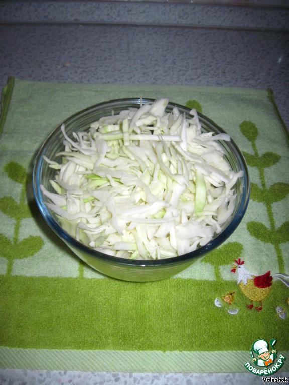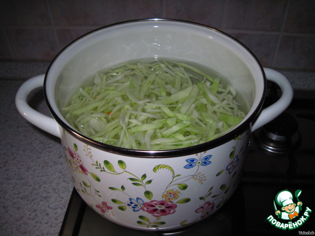 Нальем воды в кастрюлю,доведем до кипения и добавим капусту, варим 10 минут