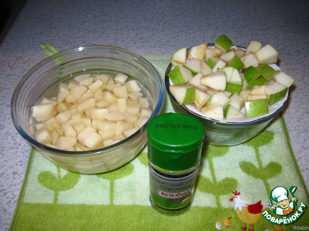 Картофель нарезаем кубиками , добавляем к капусте и варим еще 5 минут,добавляем яблоко с душистым горошком и варим еще 5 минут.