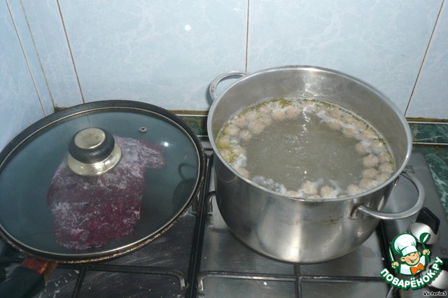 Как только фрикадельки всплыли, ставим тушиться свеклу. Для этого посыпаем ее солью, сахаром (чтобы цвет не меняла), заливаем 1,5-2 поварешками бульона, закрываем крышкой и тушим на среднем огне.