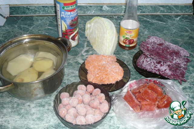 | Этот рецепт будет интересен занятым мамам, а также тем, кто в силу разных причин предпочитает легкую или диетическую пищу. Скорость достигается заблаговременной заготовкой (заморозкой) мясных фрикаделек, нашинкованных свеклы и моркови. |