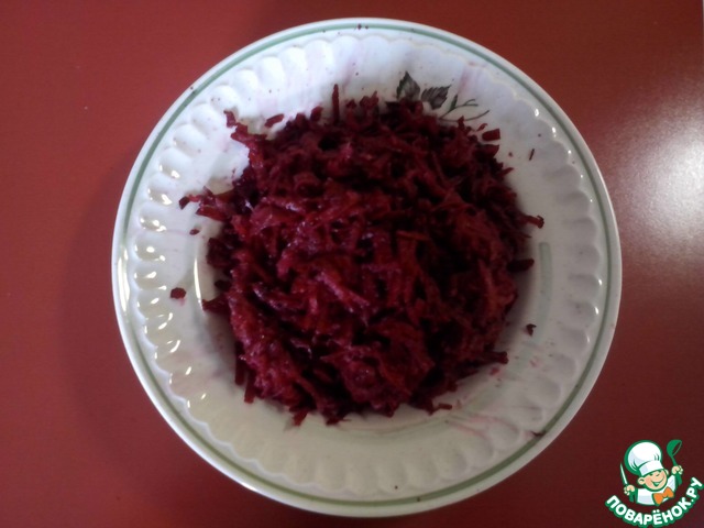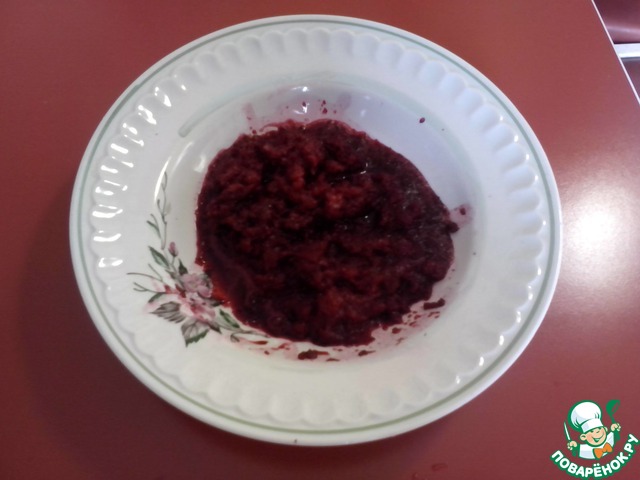Натираем на мелкой терке одну свеклу, чтобы получилось подобие свекольного пюре.
