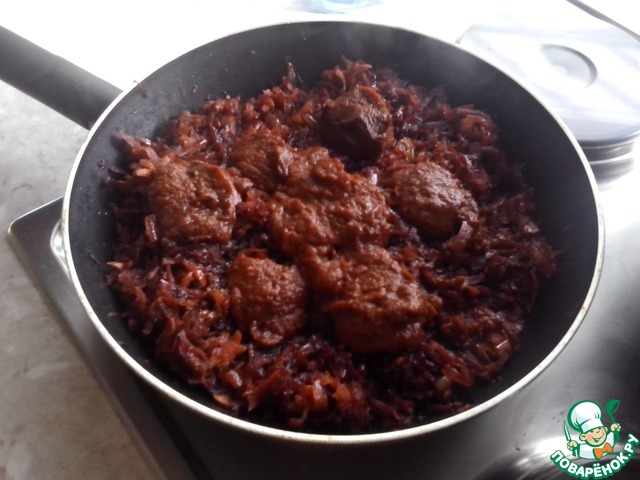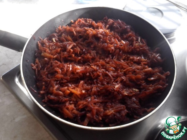 Выкладываем на разогретую с маслом (я люблю нерафинированное) сковородку лук, морковку и свеклу. Обжариваем все это 10-15 минут.