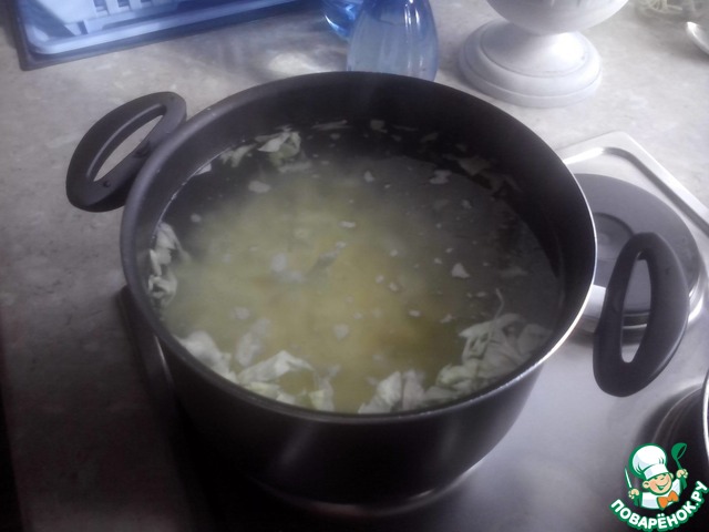 Кладем картофель и капусту в кастрюлю с кипящей водой и варим минут 5.