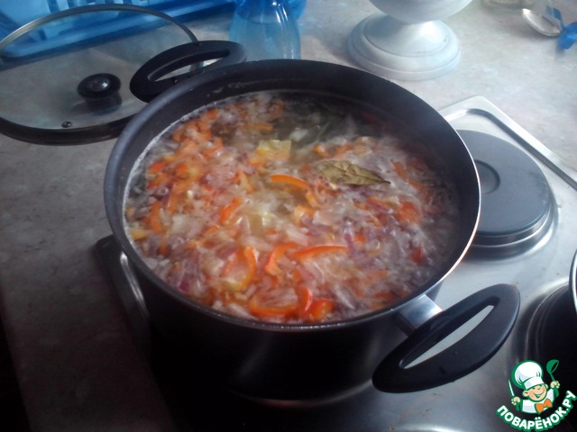 Добавляем в кастрюлю с картофелем и капустой болгарский перец, красный лук и чеснок.