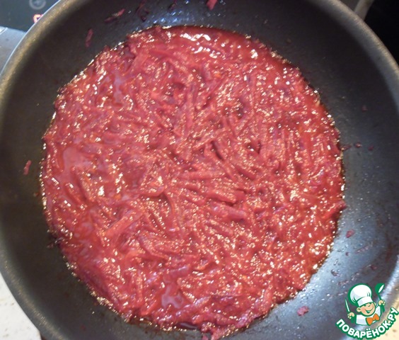 Свеклу натереть и обжарить в половине масла. Добавить томатную пасту, сок лимона, немного грибного бульона, потушить минут 10.