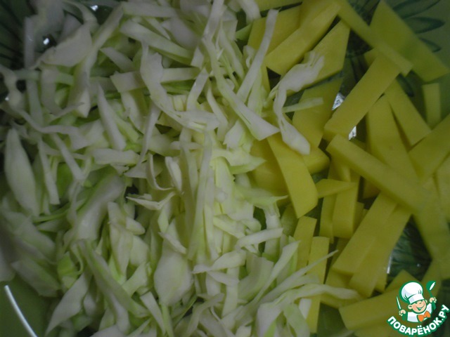 Картофель нарезать брусочками, капусту-соломкой.