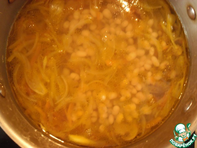 Бульон довести до кипения, положить картофель, капусту, варить 15-20 мин. Добавить фасоль, лук с морковью, варить 5 мин.