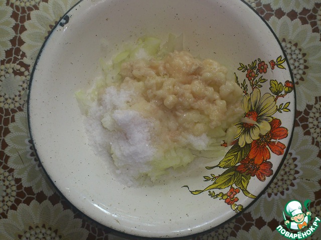 Картофель варится 20 мин., и у меня есть время сделать такую своеобразную кашицу для нашего борща из сала, соли и лука: мелко режу и скалкой все толку (я так думаю, можно это сделать и блендером).