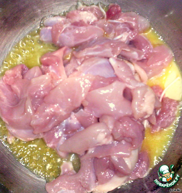 Сливочное масло растопите в кастрюле, где будете готовить суп. Поджарьте нарезанное куриное мясо.