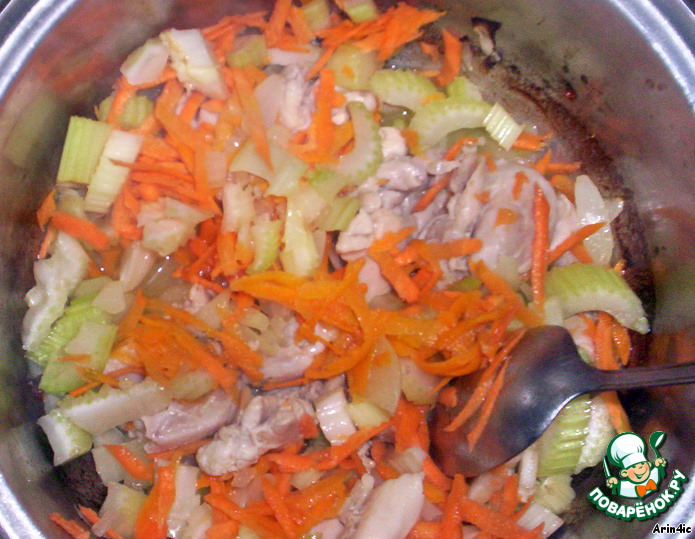 Нарежьте сельдерей и обжарьте его вместе с овощами и мясом в течении 10 минут. Положите нарезанный кубиками картофель и налейте стакан воды. Тушите на маленьком огне до готовности картофеля.