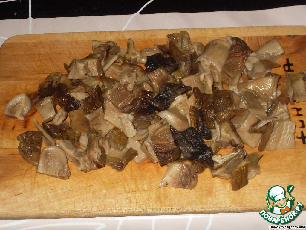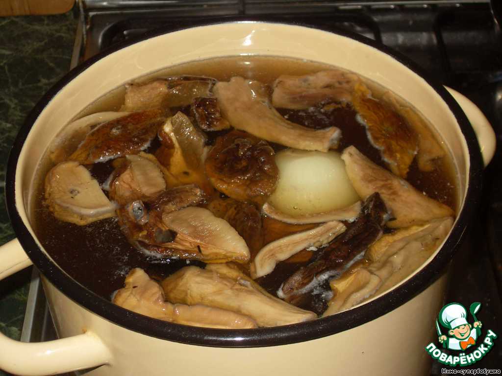 Грибы (у меня белые) хорошо промыть и замочить в теплой воде на несколько часов. Затем выложить грибы вместе с настоем в кастрюлю (3,5 л), долить воды, добавить очищенную луковицу и поставить на огонь. Сварить грибы до готовности, вынуть шумовкой в миску.