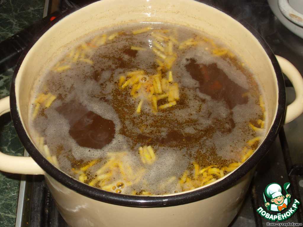Бульон довести до кипения и опустить в него картофель. Варить на слабом огне почти до готовности.