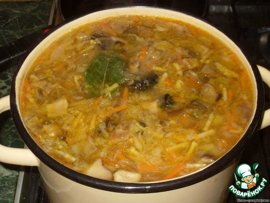В последнюю очередь добавить капусту, посолить, если требуется, положить лаврушку и варить на слабом огне до готовности овощей.