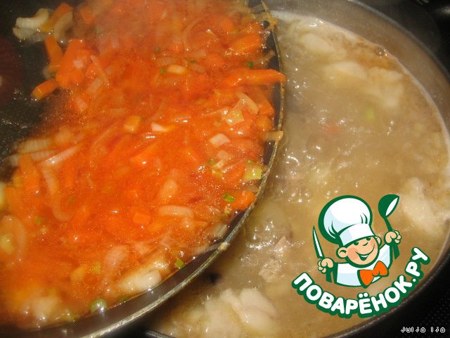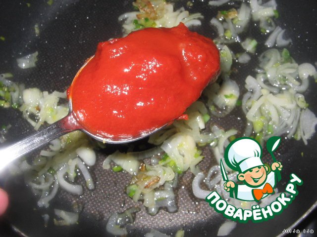 Добавляем томатную пасту. Наливаем немного бульона из кастрюли.